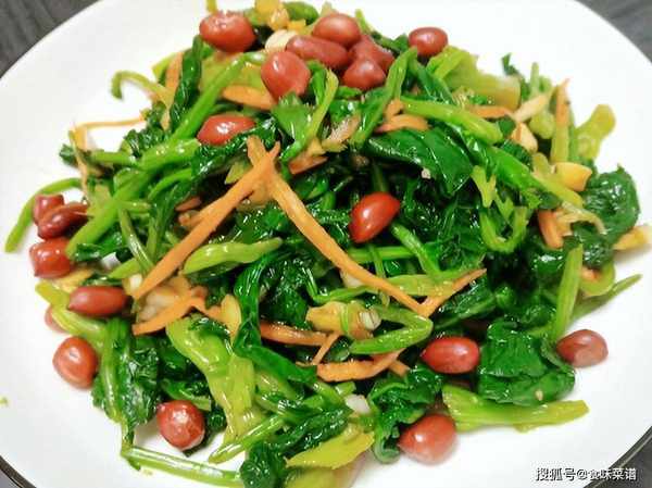2、把菠菜和胡萝卜混合在一起,抓上一把炸花生米,调味放生抽、食盐、芝麻香油、生抽,搅拌均匀,就可以开吃了,鲜香美味,营养丰富,下酒下饭都合适。