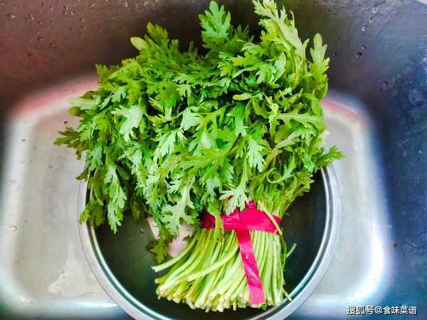1、准备一把新鲜的茼蒿,清洗干净,控干水分,改刀切段,茼蒿的营养价值高,在古代有“皇帝菜”的称号,茎叶嫩时可食,有蒿之清气、菊之甘香,药食同源。