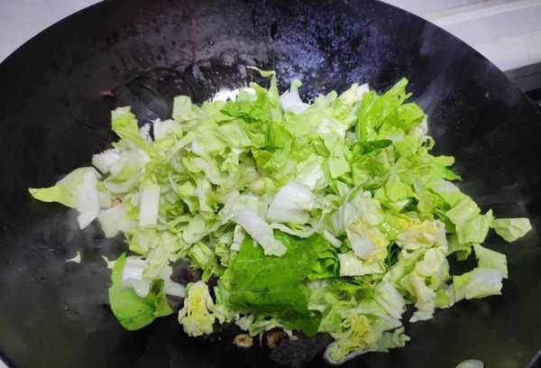 4.将米饼放入锅中煎至两面热,然后将切好的白菜倒入锅中。卷心菜水分多,下锅后很快就炸好了。铲子要经常转动。白菜炸软后,里面的汁液会被血米面包吸收,软软香甜的Q球很好吃,还有一点白菜的鲜味;
