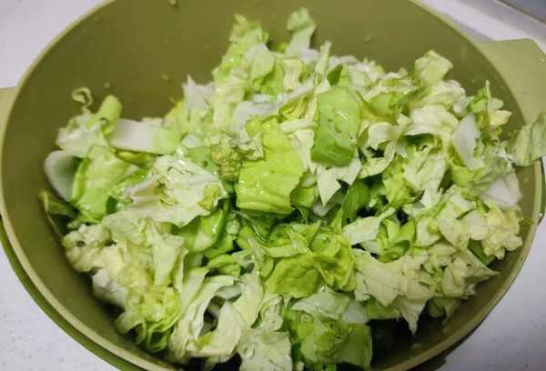 1、将准备好的白菜用清水冲洗干净,一边洗白菜一边泡水。家里种的白菜没有喷药,所以会有虫眼。用盐水泡一下可以让鸡蛋出来,洗出来的白菜会更干净。将洗净的白菜捞出用清水冲洗干净,放在砧板上切成小块放入锅中待用;