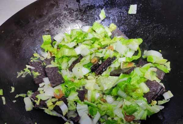 差不多完成的时候,用铲子把蛋糕打散,就很容易放进去了。如果说是炒的,但是里面还有很多水,可以生火把里面的汤汁收起来,喂进米血糕里,入味入味。