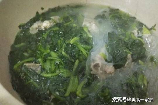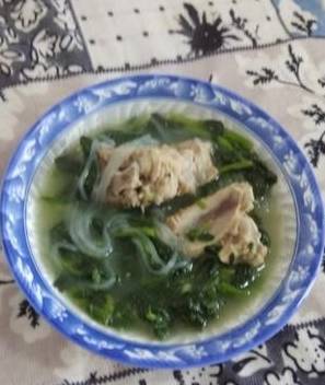 猪骨(孰)适量、菠菜700克、粉条适量、精盐少许、鸡精少许