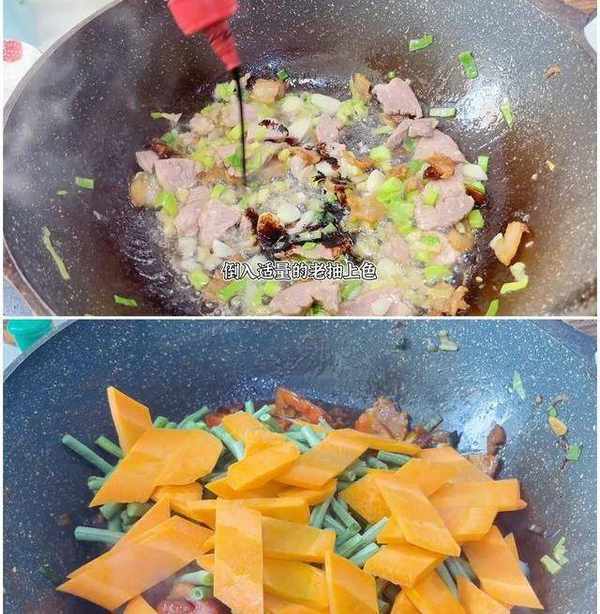 锅热倒入适量的食用油,放入肥肉片,开中小火给他煸出油脂,一直煸到金黄,这样子 吃起来肥而不腻,特别香。然后放入瘦肉 翻炒至瘦肉变色,放入葱姜蒜 八角, 翻炒出香味, 再倒入点料酒去腥 。根据自己的口味,加入适量的食用盐,胡椒粉,。生抽 蚝油,把所有的调味料翻炒均匀 放入切好的西红柿丁,炒出汁水, 放入豆角,胡萝卜,继续炒至断生,让所有的调味料融合在一起,再倒入200毫升的清水。