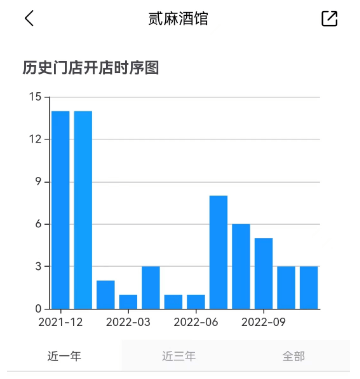 以当下最热门要数贰麻酒馆为例,贰麻酒馆虽属于中式小酒馆行列,但更偏赛博朋克风格。2022年上半年,贰麻酒馆发展速度很慢;但下半年之后,门店新开速度就加快了,平均每月开店也接近5家左右。