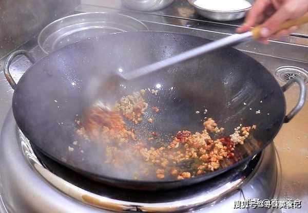 煸炒一会儿,肉末炒香炒变色以后,