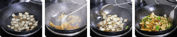 ②锅中加少许油,下葱爆香,下辣白菜煸炒,然后下洋葱和青椒,豆干,一起煸炒,加韩式辣酱、盐、鸡精、糖,加水40克,大火烧开转小火;