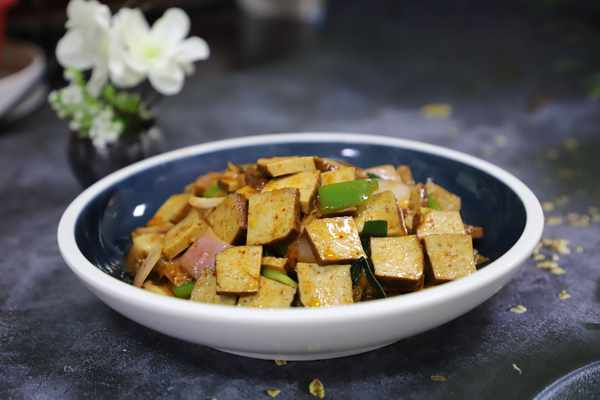 ①蜂窝豆干切成2*2厘米,厚0.5厘米的片,焯水备用;青椒、洋葱也切成同样的片;韩式辣白菜切小;大蒜叶切两厘米的段;
