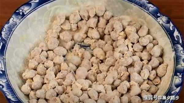 2.加入一勺淀粉和适量的水,用棒子搅拌均匀,然后加入一大勺面粉,面粉要定时加入,让坚果均匀的沾满面粉,搅拌至混合。完成的