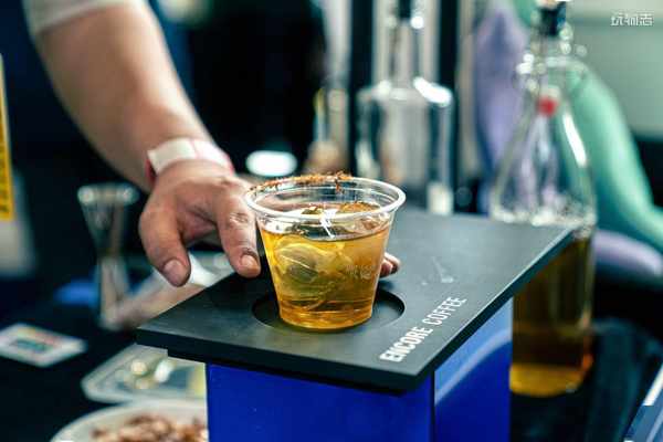 狼人咖啡的摊位上,摆了一排看似是化学仪器的物件,还隐隐发着红光,以技术流的姿态,在一众品牌里脱颖而出。