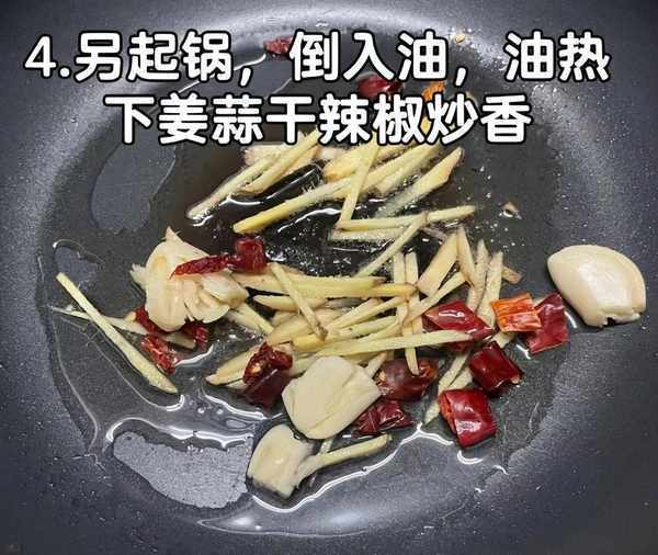 2:生姜适量切丝,干辣椒切小块,去一层蒜,蒜切丝,小葱切丝。
