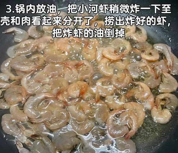 4:锅中加入少许食用油,倒入沥干的小河虾,将小河虾炸至变色,捞出沥干油,备用。