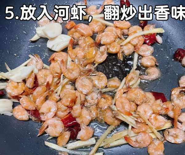 5:锅提前烧热,加入一些姜丝和蒜片,加入一些干辣椒,快速翻炒出蒜香,加入小河虾翻炒一分钟。