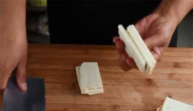 3、压几小时后,捞出豆腐。这时候的豆腐压得很重,从中间对半切开。