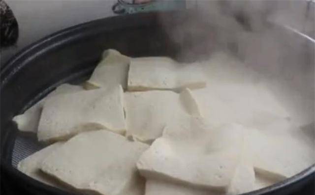1.准备两块洗干净的豆腐,把豆腐全部切成均匀的薄片,把豆腐放在蒸盘上,盖上毛巾,锅里放水烧开,水开后直接上锅蒸,高温蒸5-6分钟后,豆腐蒸熟取出晾凉。