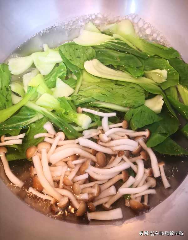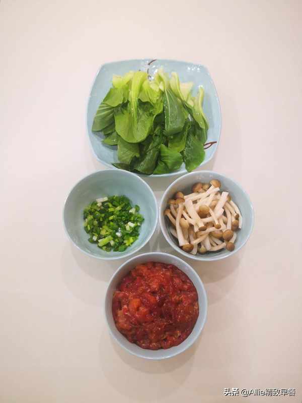 准备点青菜、葱花、蟹味菇,配菜可以根据自己的喜好调整。