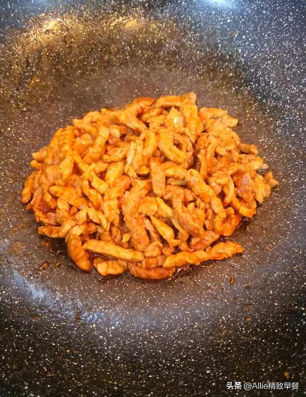 热锅冷油,倒入瘦肉丝翻炒至肉变色。
