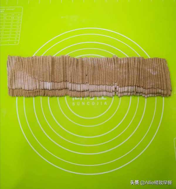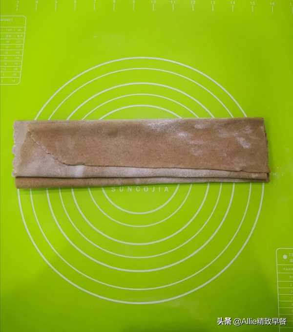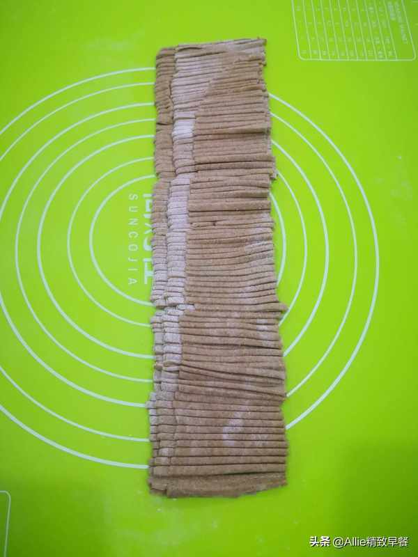 擀出一张厚1毫米的大面团,两面撒少许干面粉防粘,然后对折成宽条。