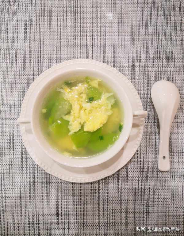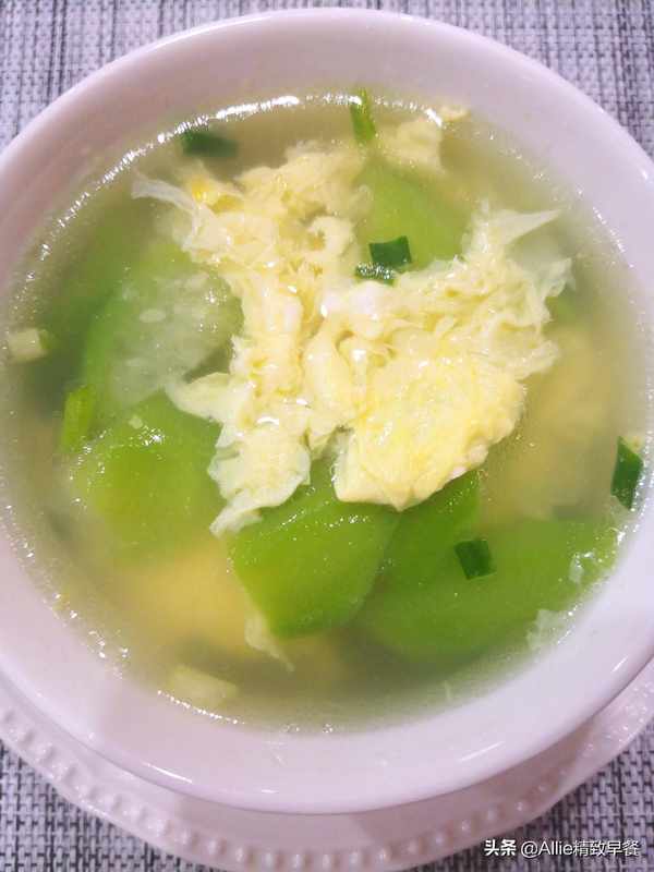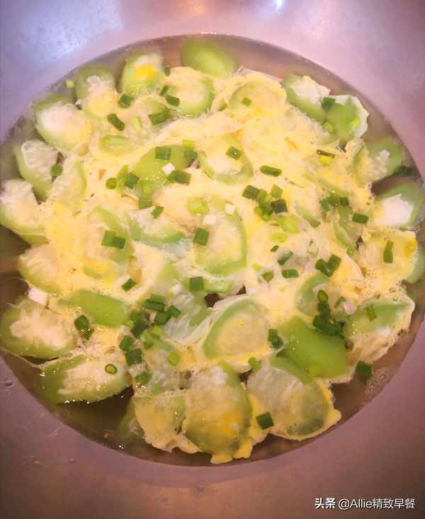 锅内加入适量水,倒入丝瓜,加适量盐和猪油,煮至丝瓜变软,关火,打圈倒入蛋液,撒上一些葱花蛋液凝固后。