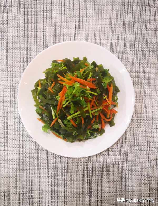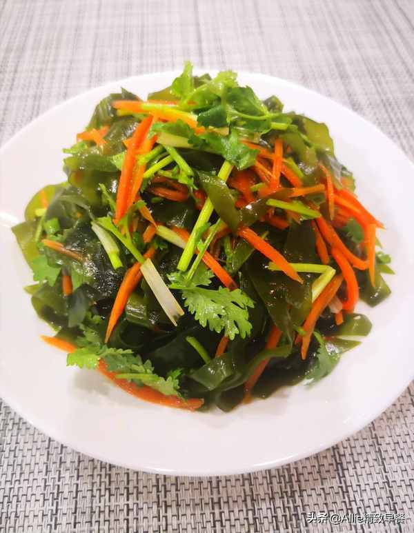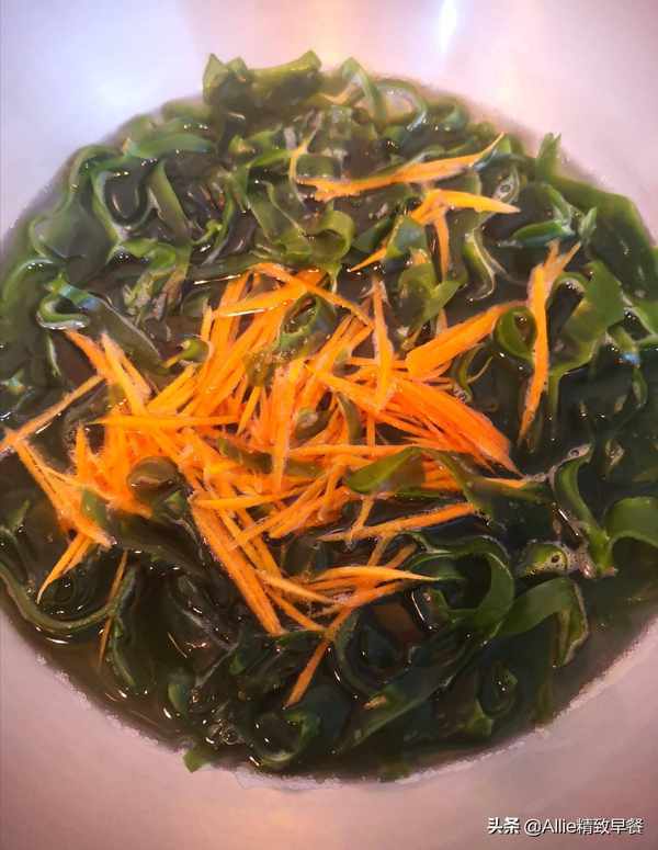 水开后,倒入泡好的海带丝煮1分钟,再倒入胡萝卜丝继续煮30秒,捞出控水。