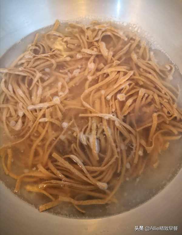 煮好后取出水快速过冷水两遍,然后沥干水分。冷水过后,面条清爽爽口。