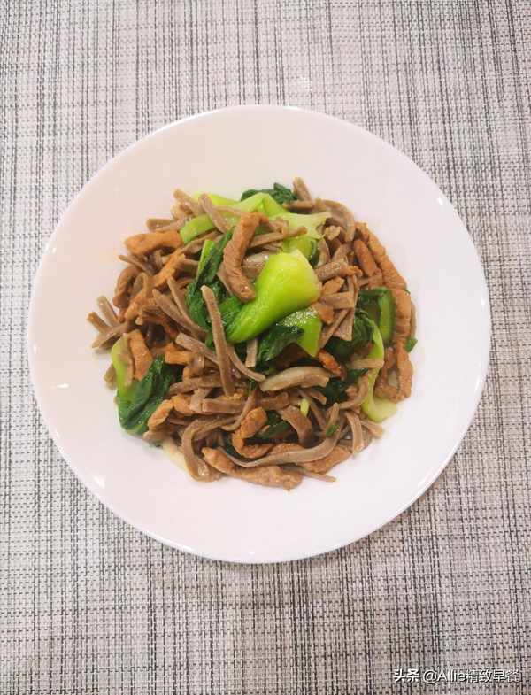 瘦肉丝加入盐、生抽、老抽少许、淀粉拌匀,加入少许凉熟的食用油,拌匀腌20分钟。嫩滑,不黏腻。