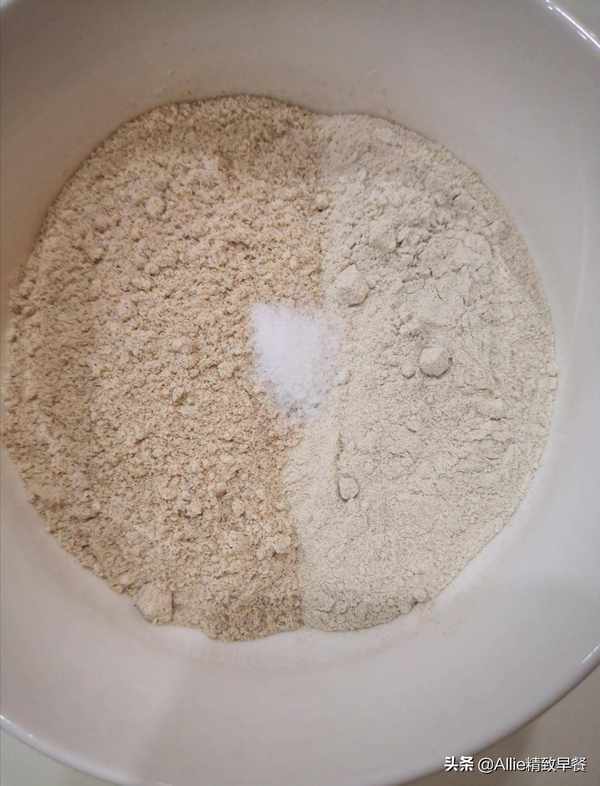 黑麦粉、荞麦粉、冷水、盐、猪肉、青菜、蟹肉菇、葱花。调料:油、盐、生抽、老抽、淀粉。【实践】碗中加入适量的黑麦粉和荞麦粉,黑麦粉和荞麦粉的比例约为4:1,加适量盐。加盐的目的是为了增加面团的韧性和筋度。