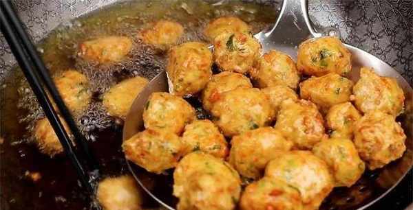 3.锅里放油烧热,虎口搓成丸子入锅炸。