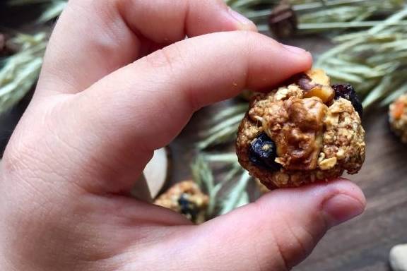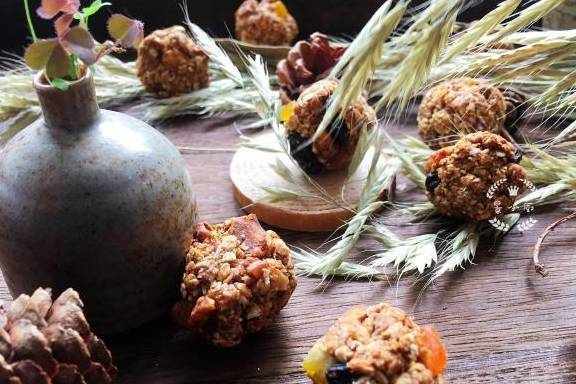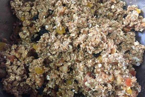 食材:即食燕麦250g,去皮后熟透香蕉100g,蜂蜜15g,红糖10g,核桃仁80g,随意果干50g,牛奶50g,鸡蛋一个,香草精3g,肉桂粉2g,小苏打2g,低筋面粉30g