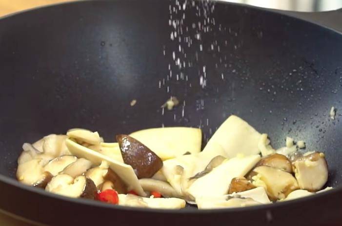 第二步:锅内加入适量的油,倒入蒜末用50%的油温炒香,再将准备好的三种香菇倒入锅中,翻炒至全身变软,大约三分钟。