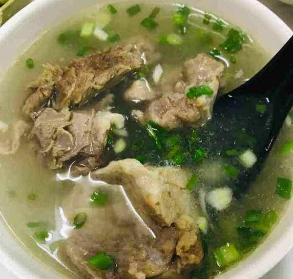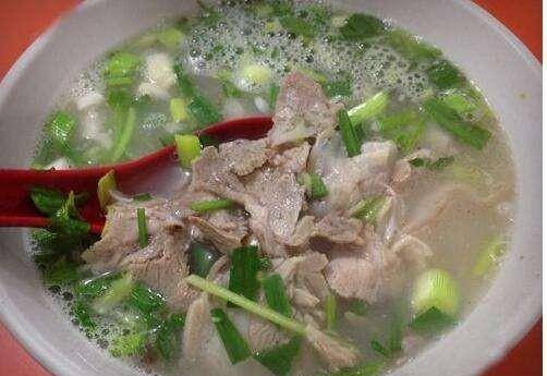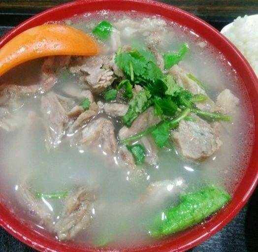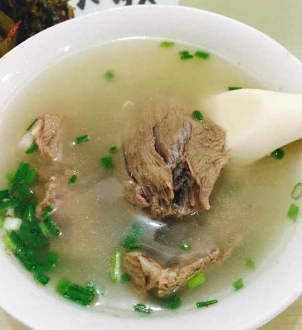 猪头肉煮好之后,老板先要剔去骨头,再把肉切成片,放到碗里又淋上汤。除了肉是猪肉之外,其它的配料和羊肉汤的配料差不多,汤汁的味道喝起来酸辣酸辣的,非常开胃,再配个饼子,吃完感觉非常满足。