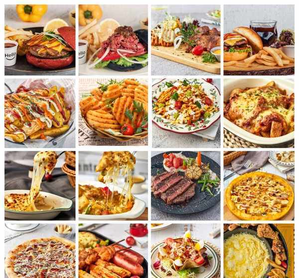 从主食、比萨、牛排、汤、沙拉、零食,