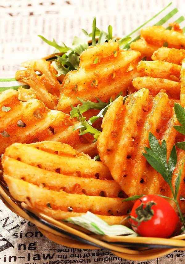 西式快餐通常还有油炸土豆点心,色泽金黄,口感酥脆,深受客人喜爱,如土豆箅子、土豆熏鲑鱼、厚土豆、炸薯条等,而且形状各异异形土豆。更强大,让食物更有趣。