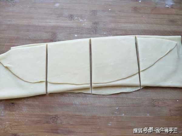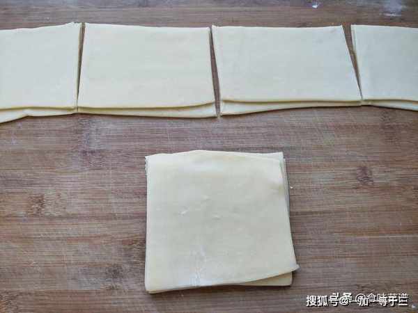 6、把长条舒展开来,继续摞在一起,横向铺在案板上,用刀切成长方形的形状。