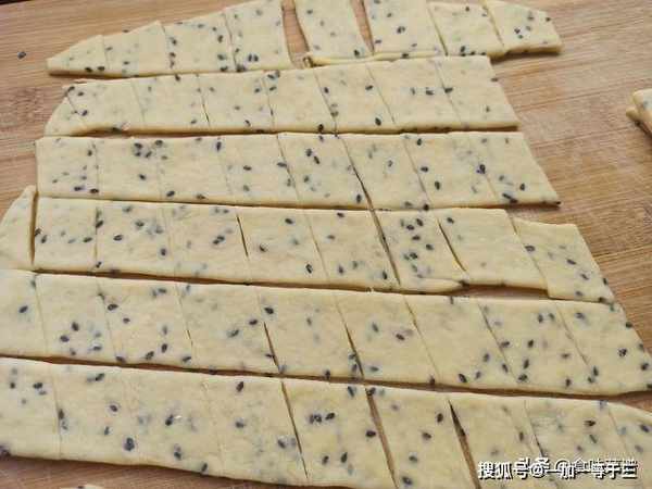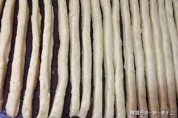 7、用快刀开始分割,距离大约1厘米,如图所示,分成一根根细小的长条,盖上一层保鲜膜,二次醒发12分钟,让长条变得轻飘飘。