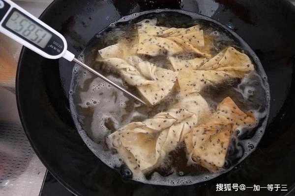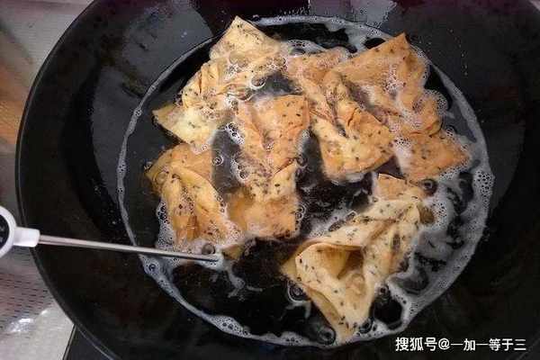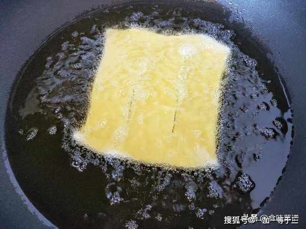 8、等油温6、7成热时,把面皮放进锅中炸,全程开小火就行,面皮非常薄,中间多翻两次,等两面金黄色就熟了,炸的过程也叫30秒钟,不易太久。