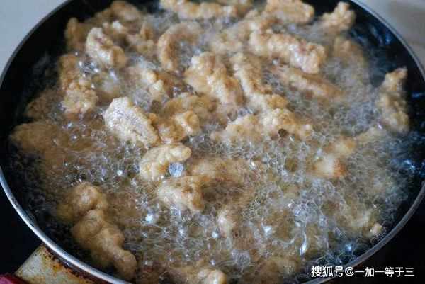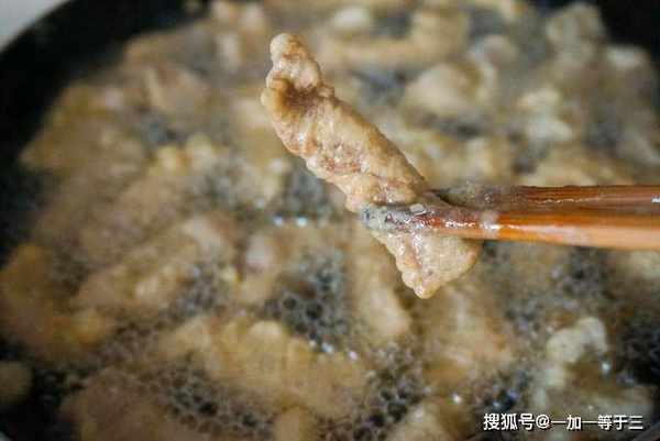 6、油温6成热时候,放入生肉片,一块一块投入锅里炸透,千万不要一次性全部倒入,容易粘连在一起。