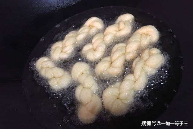 9、锅内倒油,等待油温6成热,依次下入麻花,用中小火炸,等一面定型后,再翻另外一面,用筷子勤翻动,麻花正反面都炸成金黄色,即可控油出锅。