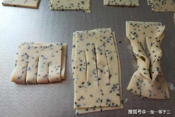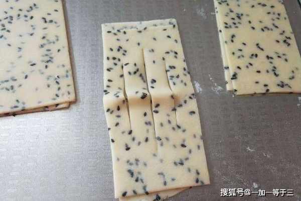 6、把两张面片重叠在一起,中间竖着切三刀,如图所示,注意力度要轻,两头不要切断,中间一道长一些,旁边两道短一点。
