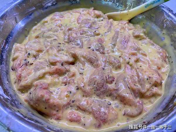 5、把之前腌好的肉片,倒进挂糊,让挂糊均匀包裹肉片,每一片都裹上面糊。