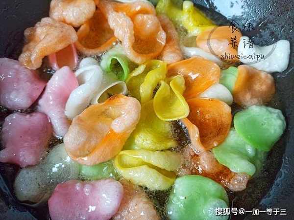 3、油尽量多一些,虾片炸得也均匀,随着油温的升高,虾片会迅速膨胀,等到完全变大,即可关火控油,炸虾片的过程非常简单,总结一下炸法:少量多次,勤翻动。