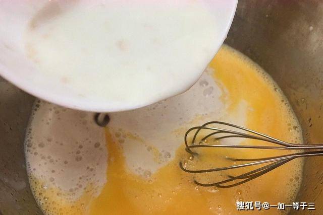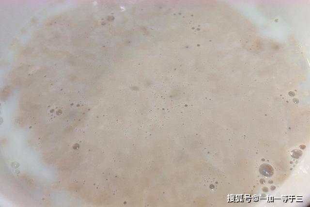 2、盆中打入2个鸡蛋,用蛋抽充分搅拌均匀,越细腻越好,然后把牛奶酵母倒进来,继续搅拌均匀。
