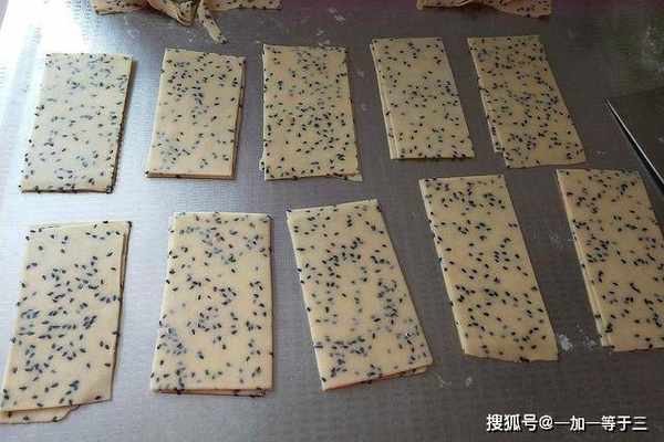 4、等待时间到了,撒些干面粉,取出面团,揉搓排气,擀成一个大面饼,正方形、长方形均可,用刀切成菱形片。