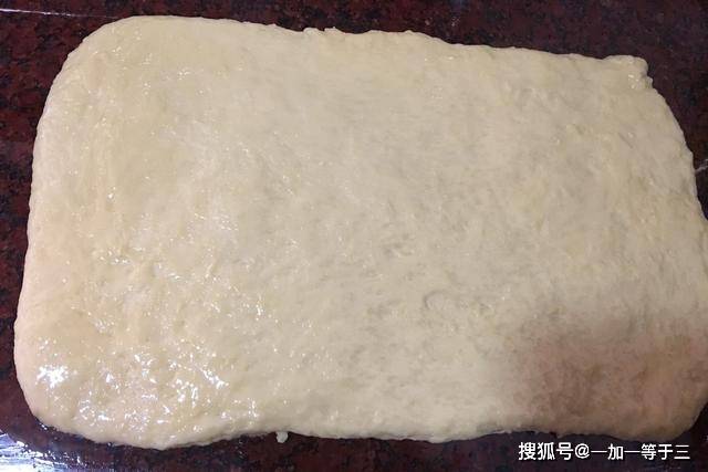 6、等时间到了,先在案板上刷一层油,把面团倒出来,再刷一层油,用擀面杖擀成一张面皮,大约30厘米X20厘米的尺寸。
