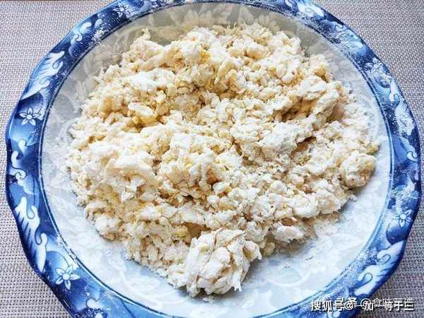 2、整个过程无需添加一滴水,有蛋液和食用油就够了,一直搅出大面絮的样子,接着下手揉成面团。
