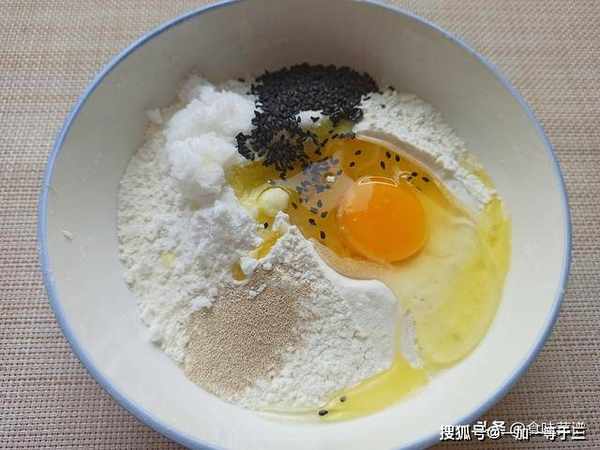1、碗中准备250克面粉,放入2克酵母粉,1克小苏打,10克植物油,2勺白糖,1勺黑芝麻,1个鸡蛋,用筷子搅匀。