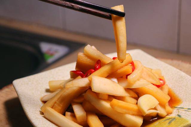 周六自己在家里面做了一点腌萝卜条,现在是白萝卜大量上市的季节,大家也可以买一些回家自己腌了。这个做法很简单,切好的萝卜杀出水分之后加入陈醋,生抽,海天米醋,还有一点白糖,蒜片,小米椒,腌制一个晚上就可以吃了!
