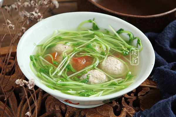 4、下鸡精,盐,放入洗干净的豆苗煮50秒即可关火出锅,豆苗煮太久就不好吃了。