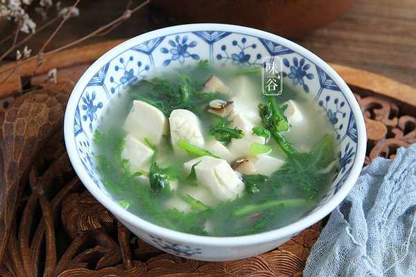 【准备食材】:豆腐 适量、茼蒿 适量、盐 少许、虾皮 适量、香菇 适量、胡椒粉 少许