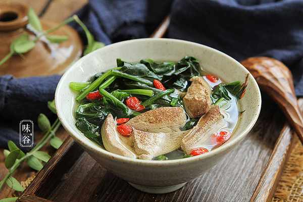 【准备食材】:菠菜 适量、猪肝 适量、盐 1小勺、生粉 1小勺、枸杞 适量、胡椒粉 少许、料酒 适量、姜 2片、