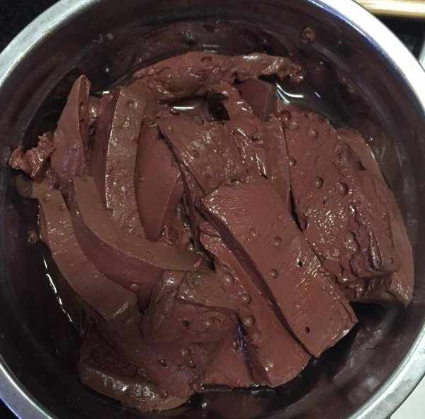 (5)放入猪血一氽,捞出放盆中清水冲洗干净;